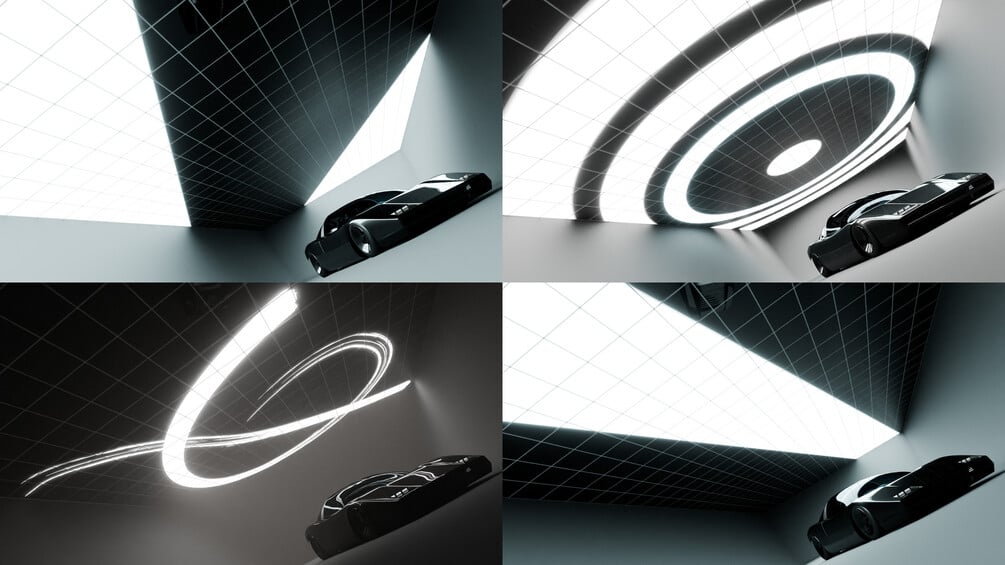( Porsche GT3 RS model by Black Snow on Sketchfab (not included), inside of the Studio 7 preset environment, with the ‘1:2 Triangles’ texture applied to the ceiling light and modified by a color gradient. )