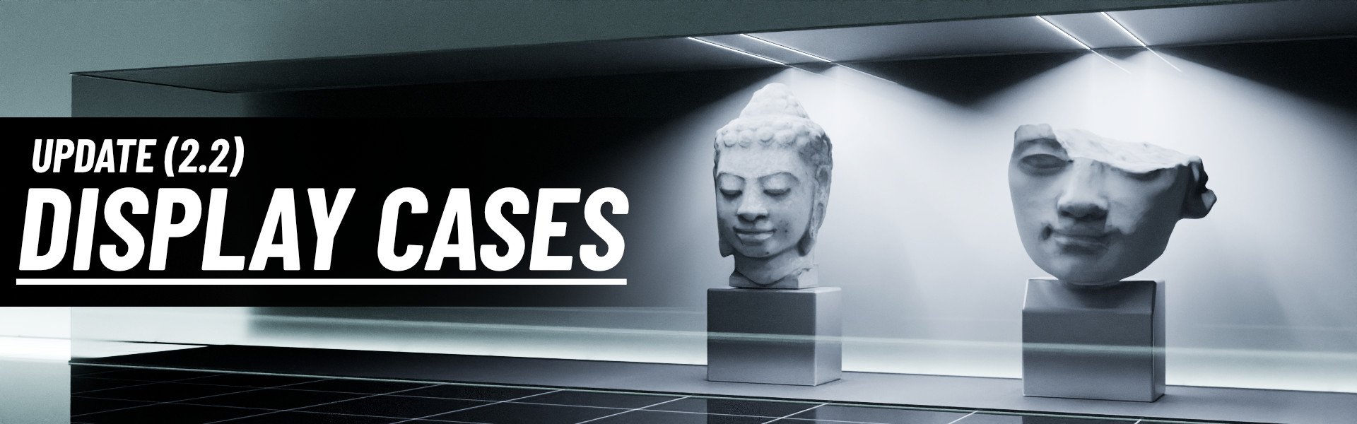 Version 2.2 adds a collection of display cases of various sizes, each following a standardized style with overhead light bars which can be easily moved around. This is especially effective for highlighting areas of focus within larger display structures. Also included with version 2.2 is a 'Physical Definition' material, specifically designed to highlight curvature details on objects (such as sculpts and scans), as seen with the 3D scans in the image above. Note that the 3D scans shown here are not included, and are available on Sketchfab courtesy of the Minneapolis Institute of Art and The Hunt Museum (CC0).
